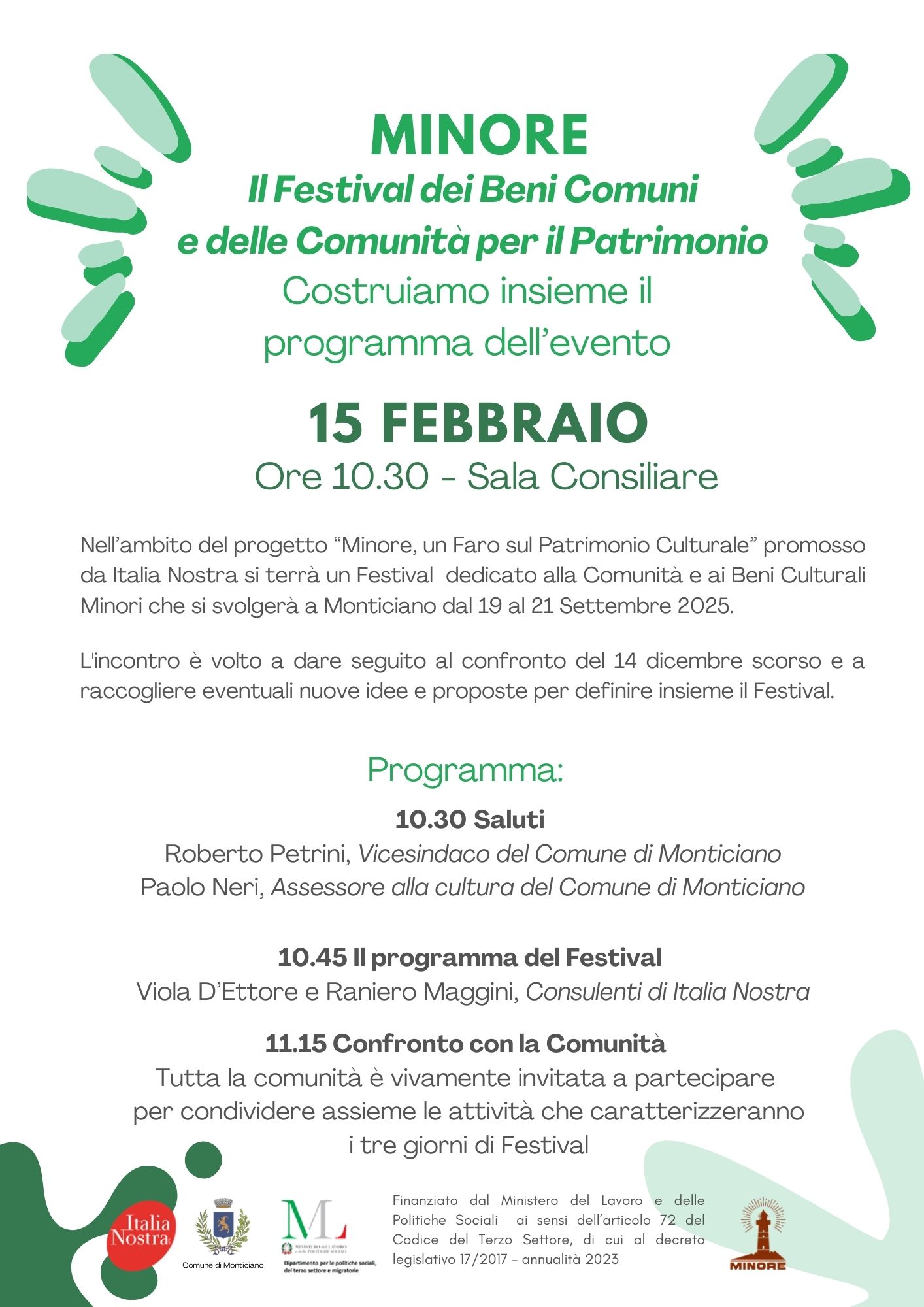 Si svolgerà sabato 15 febbraio un incontro, seguendo il confronto del 14 dicembre 2024, nella Sala Consiliare di Monticiano per discutere e definire il programma del Festival dei Beni Comuni e delle Comunità per il Patrimonio, che si terrà nel comune senese dal 19 al 21 settembre 2025.