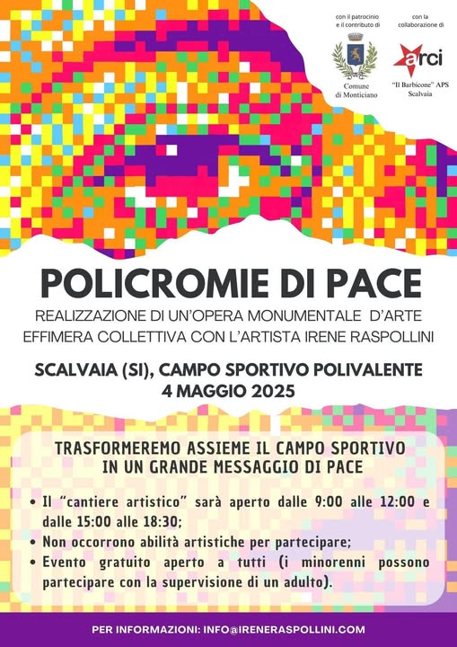 Durante la giornata di domenica tutti i cittadini di Monticiano e tutti coloro che vogliono passare una giornata di condivisione e di avviamento all'arte per dare voce alla propria voglia di Pace sono invitati a Scalvaia, sotto la guida dell'artista Irene Raspollini. I partecipanti realizzeranno, presso l'area polivalente in via Giardino, un'opera collettiva d'arte effimera con l'uso di gessi colorati, con cui inviare un messaggio di pace: "Sarà un'opera d'arte effimera realizzata con gessi colorati, perché anche la PACE è effimera, basta un niente per macchiarla o, peggio, per cancellarla. E la visione complessiva del disegno sarà possibile solo dall'alto, perché anche la PACE si può ‘vedere’ solo se abbandoniamo le nostre prospettive personali per una visione più ampia, che vada oltre al nostro raggio di azione e alla nostra aspettativa di vita". Così l'artista Irene Raspollini. E questo il messaggio che il Comune e Raspollini vogliono trasmettere e del quale vogliono rendere partecipe la comunità di Scalvaia.