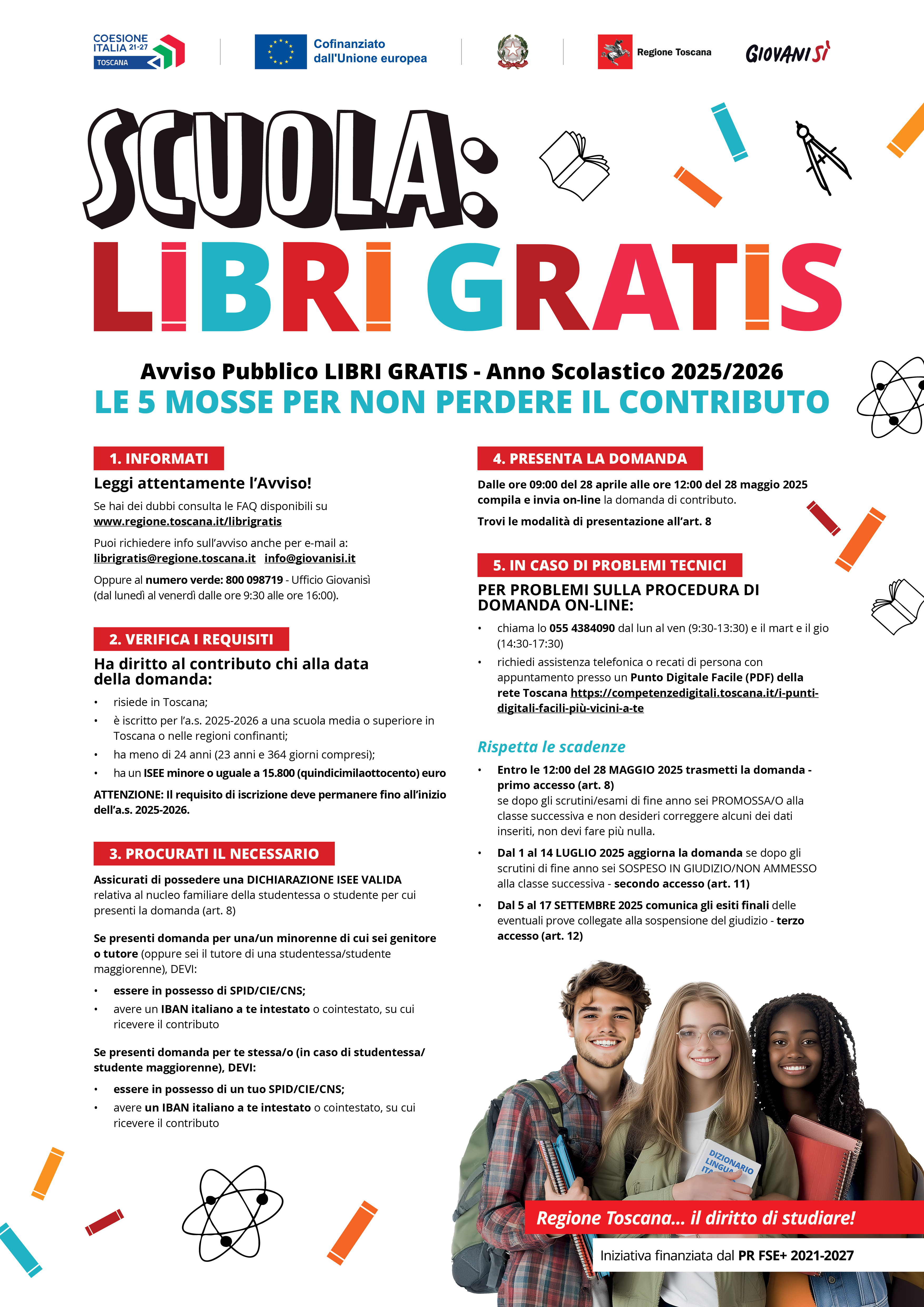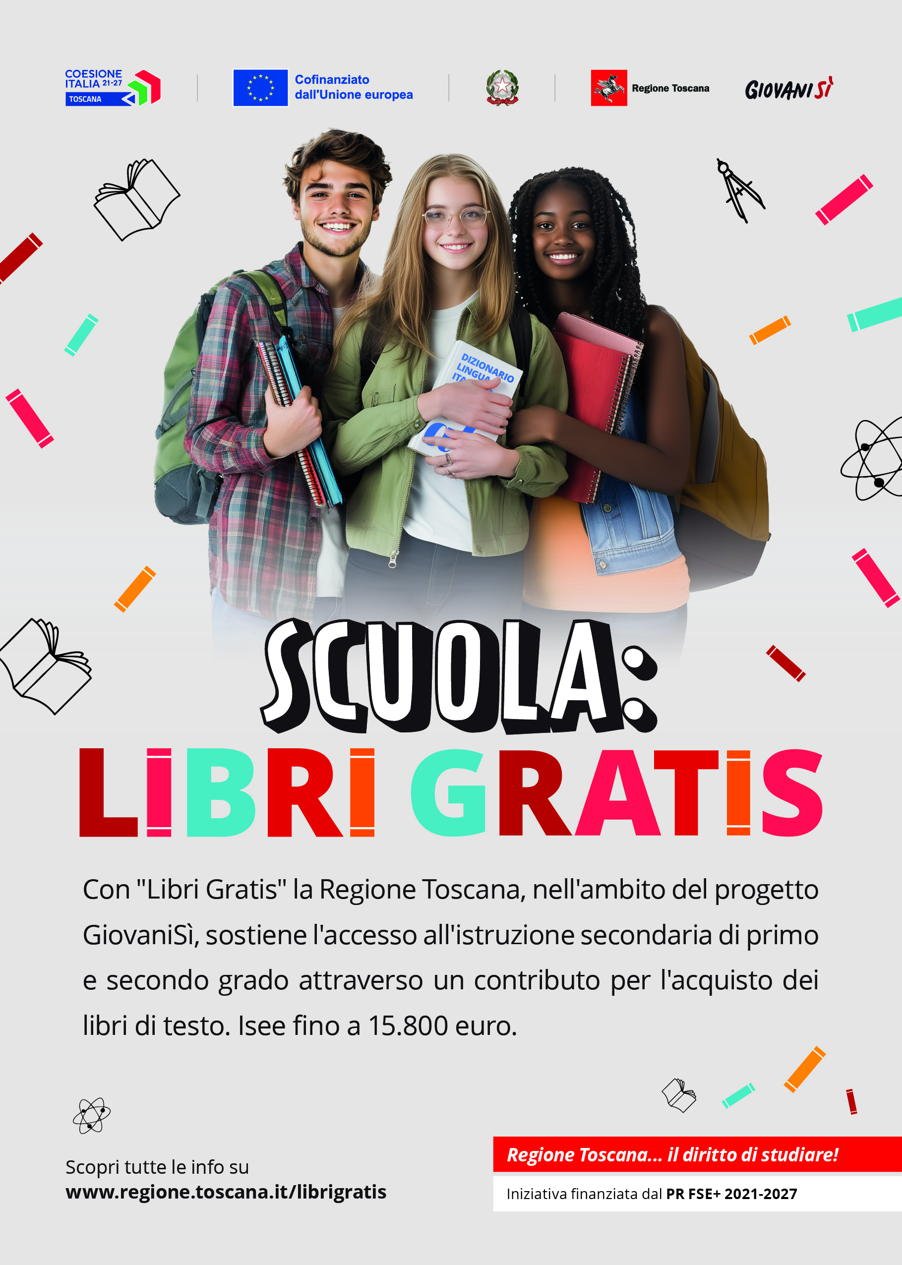 È attivo fino al 28 maggio il portale per presentare la domanda per "Libri Gratis", iniziativa promossa dalla Regione Toscana-Giovanisì a sostegno delle famiglie e delle studentesse e gli studenti nel loro percorso scolastico.